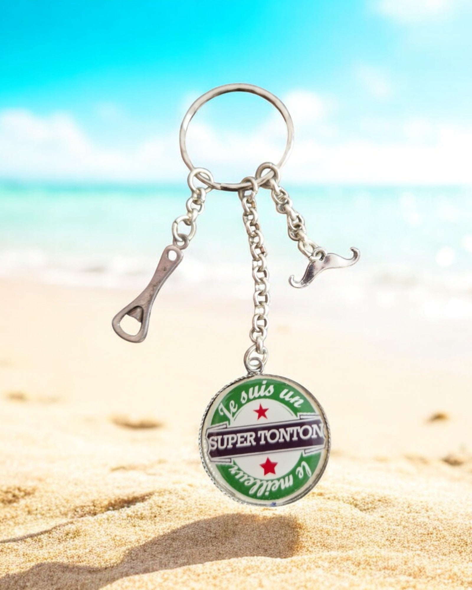- Breloques : Un dĂ©capsuleur miniature (fun et stylĂ© đ§) & une moustache argentĂ©e, clin d'Ćil au tonton cool et plein de personnalitĂ©