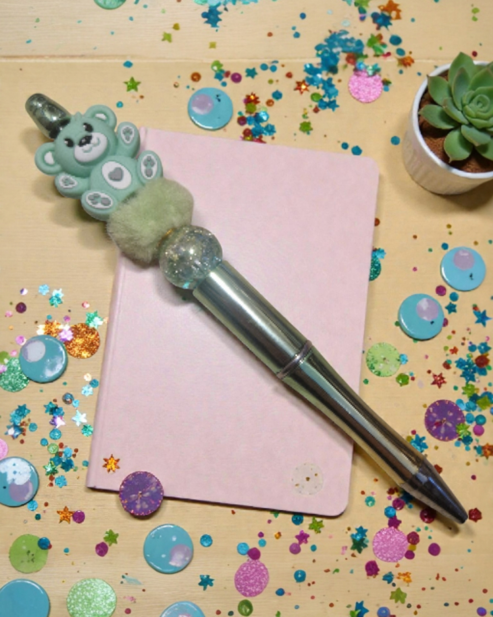 Chaque modèle est entièrement décoré à la main, avec de petites perles, des éléments scintillants et un adorable petit ours perché sur le haut du stylo – comme un compagnon bienveillant qui garde tous vos mots secrets.