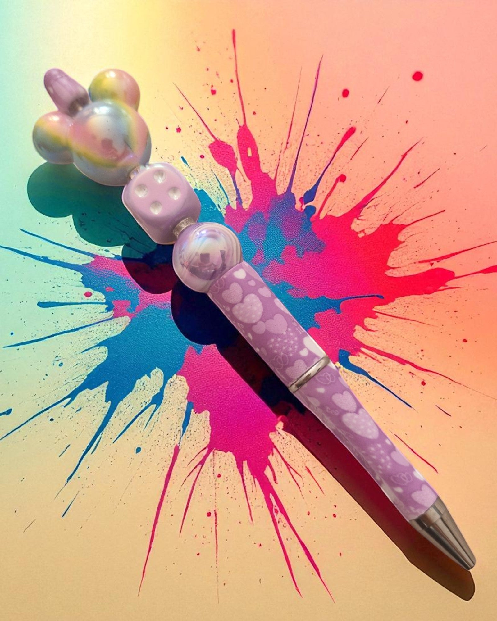 🖊️Stylo "Mickey Dice & Hearts" – Perles Irisées, Dé Décoratif & Motifs Cœurs
